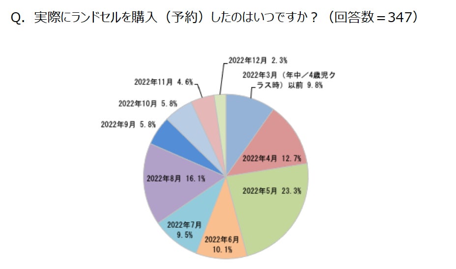 調査時すでにランドセルを購入(予約)したという人は84.7%。購入した時期は2022年5月が最多で、ついで2022年4月、8月と続きました。
