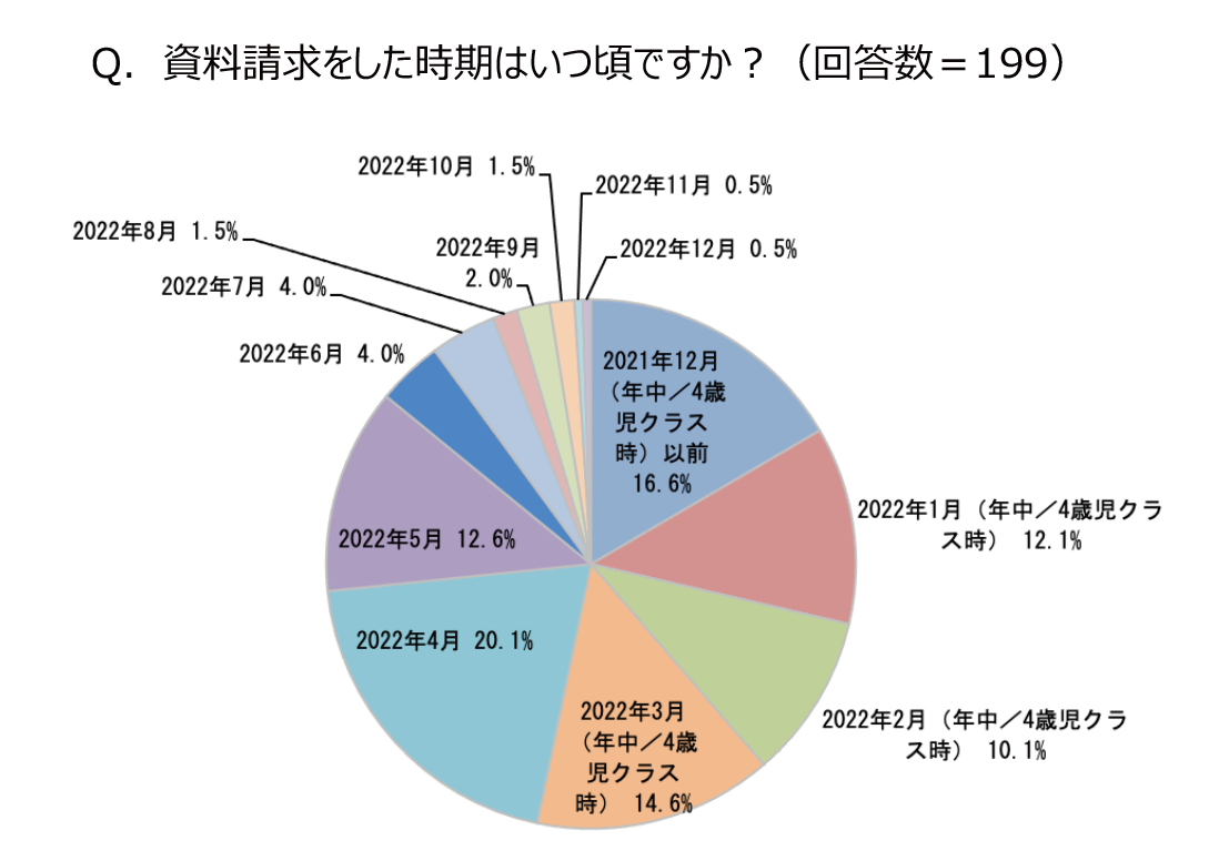 ■資料請求のタイミングは、年中12月以前〜年長5月が多数。半数以上の人が年中のうちに準備
