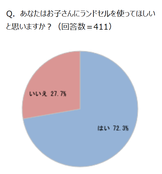 「革ではなく、ナイロンやポリエステルでできた通学用バッグがあることを知っていますか?」という質問には、「知っている」と回答した人が73.0%。また、「あなたはお子さんに(通学用バッグではなく)ランドセルを使ってほしいと思いますか?」と聞いたところ、「はい」と答えた人が72.3%でした。「ランドセルを使ってほしい」という意見としては「日本の文化の一つだと思うから」「小学生のシンボルだから」「6年間使うものなので、長持ちしてほしいから」という声が集まった一方で、「いいえ」と答えた人は、「通学バッグの方が軽く、体に負担がかからなそうだから」などの意見がありました。ランドセルは子どもの体への負担減に対する期待が高まり、通学バッグは丈夫さを懸念する声が多く今後の進化に注目が集まりそうです。