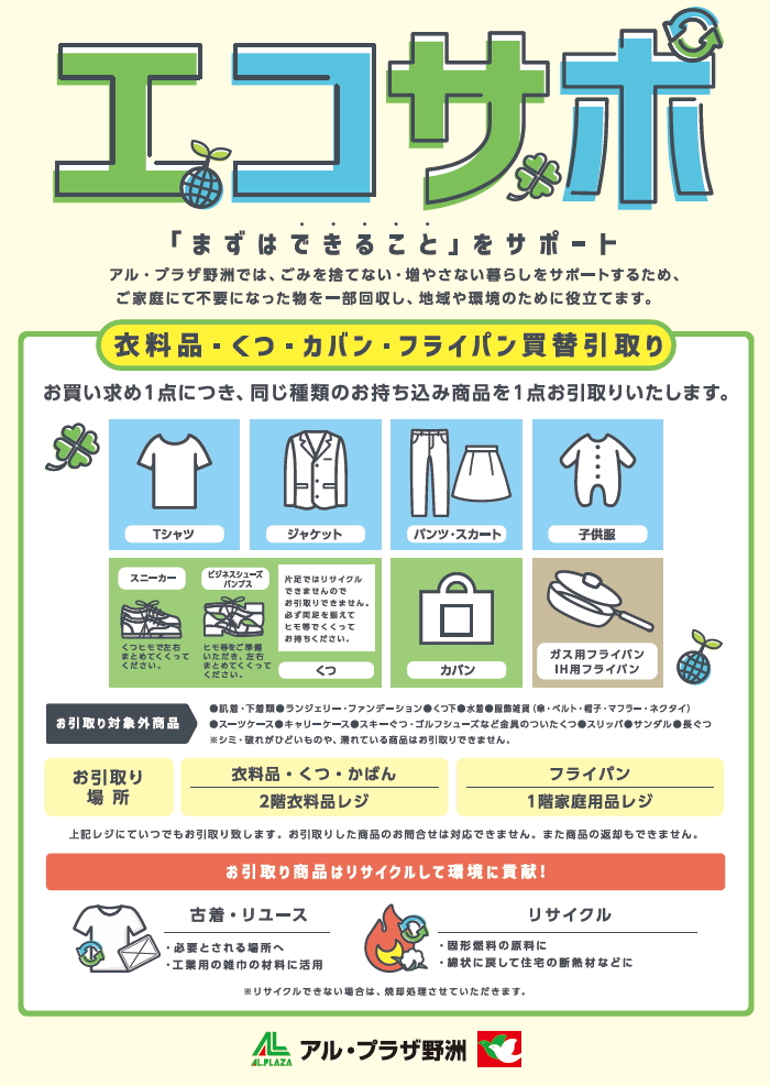 「まずはできることをサポート」をキーワードに、ご家庭で不要になったものの一部を店頭で回収し、地域や環境のために役立てます。