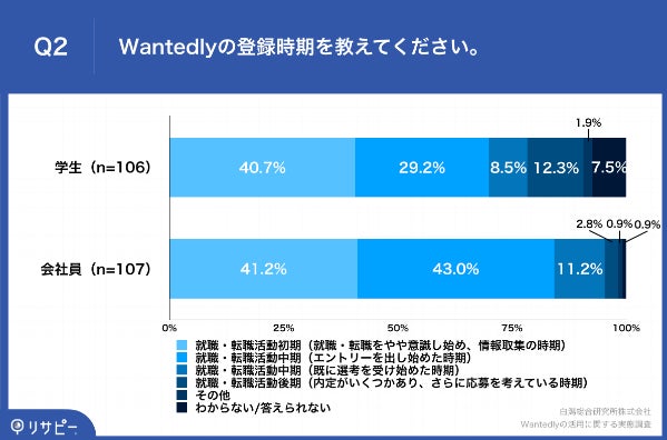 「Q2.Wantedlyの登録時期を教えてください。」と質問したところ、学生(n=106)は「就職・転職活動初期(就職・転職をやや意識し始め、情報取集の時期)」が40.7%、「就職・転職活動中期(エントリーを出し始めた時期)」が29.2%、会社員(n=107)は「就職・転職活動初期(就職・転職をやや意識し始め、情報取集の時期)」が41.2%、「就職・転職活動中期(エントリーを出し始めた時期)」が43.0%という回答となりました。