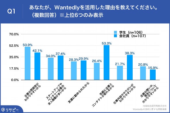 「Q1.あなたが、Wantedlyを活用した理由を教えてください。(複数回答)」と質問したところ、学生(n=106)は「企業の雰囲気がわかりやすいから」が50.9%、「スタートアップやベンチャー企業の求人掲載が多いから」が34.0%、「友達に勧められたから」が28.3%、会社員(n=107)は「気軽に企業とコンタクトが取れるから」が53.3%、「企業の雰囲気がわかりやすいから」が42.1%、「仕事内容ややりがいがわかりやすいから」が38.3%という回答となりました。