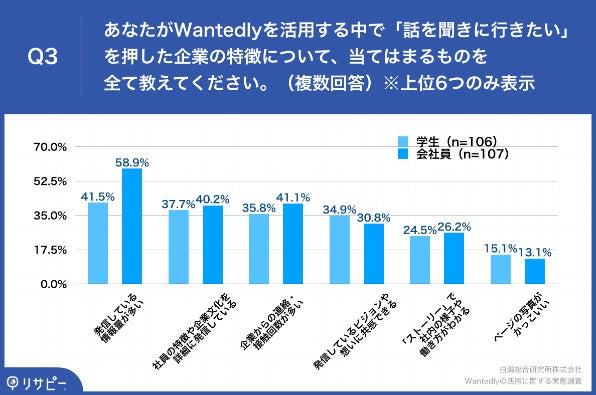 「Q3.あなたがWantedlyを活用する中で「話を聞きに行きたい」を押した企業の特徴について、当てはまるものを全て教えてください。(複数回答)」と質問したところ、学生(n=106)は「発信している情報量が多い」が41.5%、「社員の特徴や企業文化を詳細に発信している」が37.7%、「企業からの連絡・接触回数が多い」が35.8%、会社員(n=107)は「発信している情報量が多い」が58.9%、「企業からの連絡・接触回数が多い」が41.1%、「社員の特徴や企業文化を詳細に発信している」が40.2%という回答となりました。