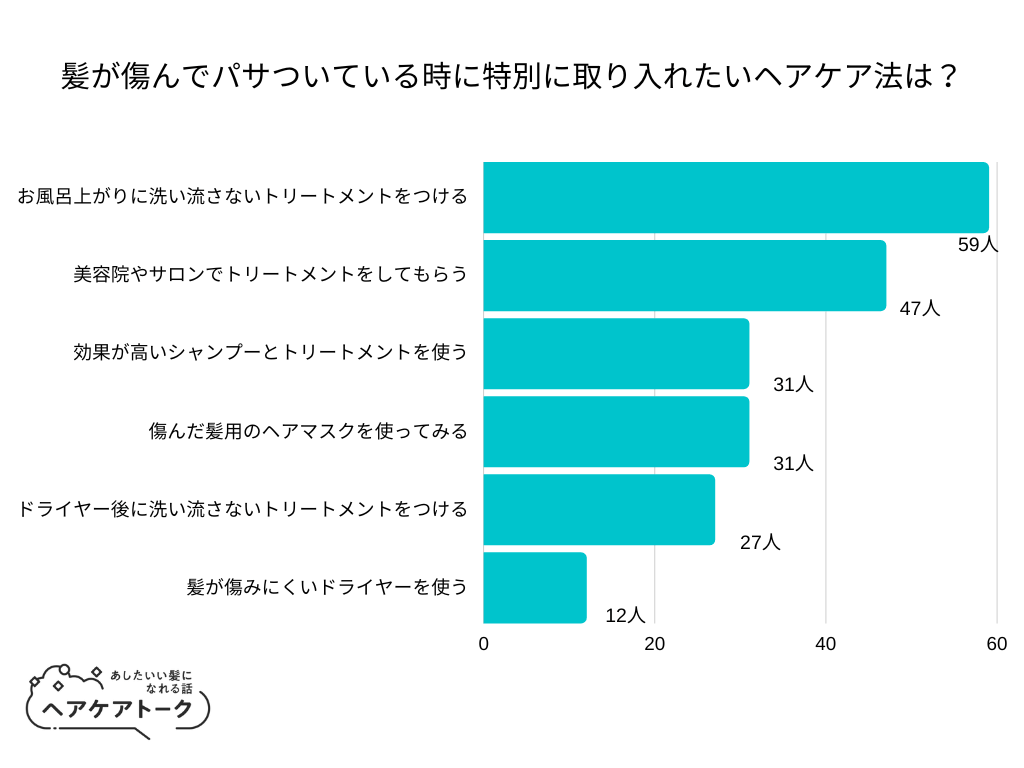「髪が傷んでパサついている時に特別に取り入れたいヘアケア法は?」とアンケート調査した結果、1位は『お風呂あがりに洗い流さないトリートメントをつける』でした。