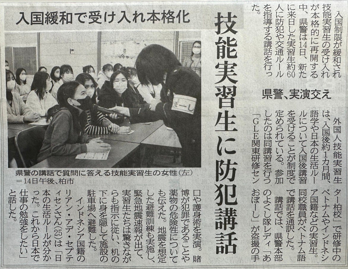 来日した実習生約60人を対象に千葉県警の協力のもと、防犯や交通ルールを指導する講話が実施されました。
