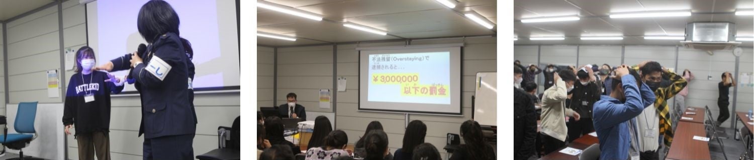 県警本部のよくし隊レディ「あおぼーし」が盗撮の手口や犯罪に巻き込まれないための対策、護身術を実演しました。賭博が犯罪であることや薬物の危険性についても伝えました。また、罪を犯したときの罰金や罰則等、日本の法律についても学びました。