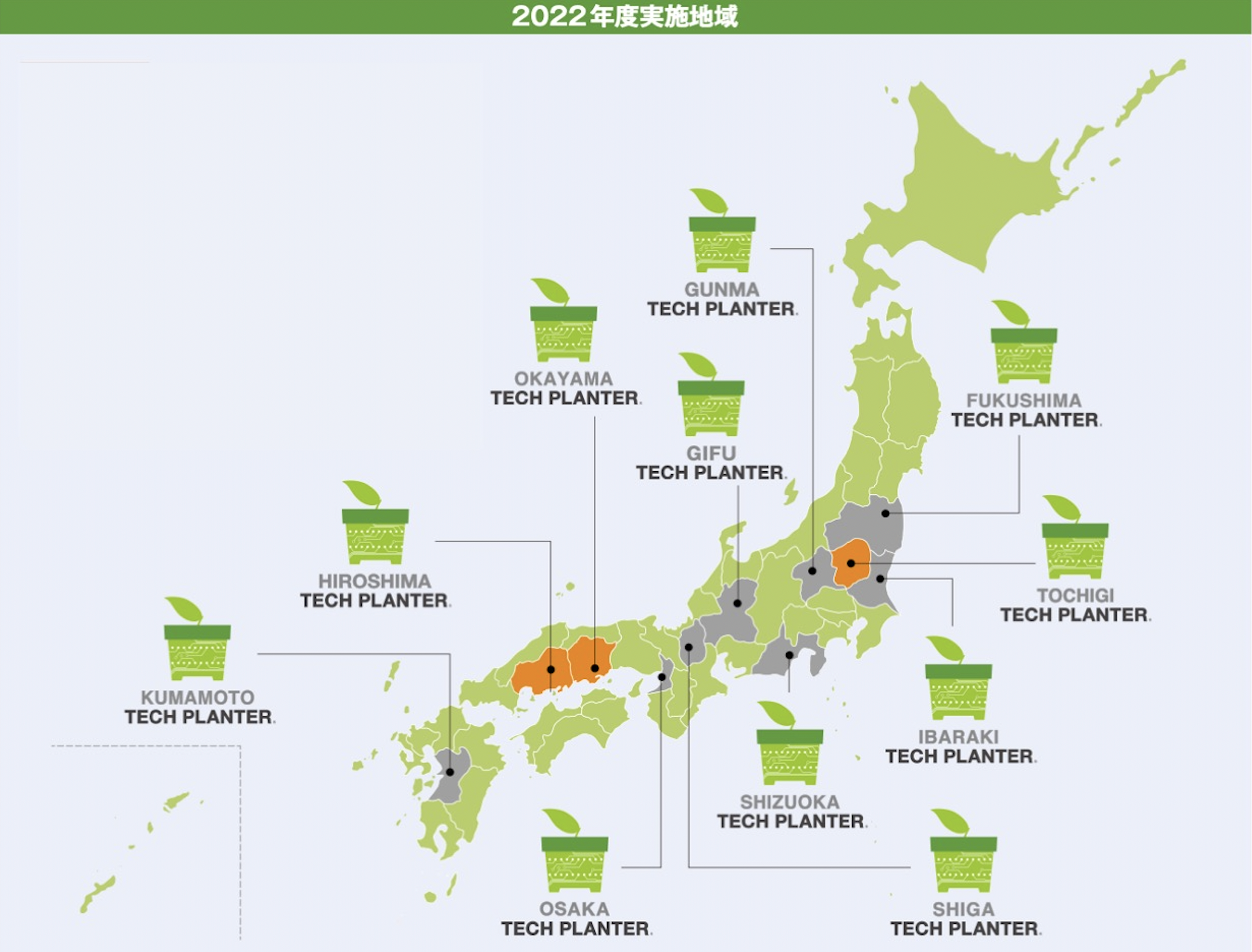 地域テックプランターは地域でメガベンチャーを生むエコシステムとして2016年より開始し、2022年現在は全国12地域に広がっています。本プログラムでは、科学技術による社会課題の解決とビジネスプランを発表する場である「テックプラングランプリ」 を軸に、技術シーズの発掘、社会実装プランの策定、そして事業化に向けた支援を年間を通じて行います。 2022年は12地域で53社がパートナー企業として地域テックプランターに参画しました。