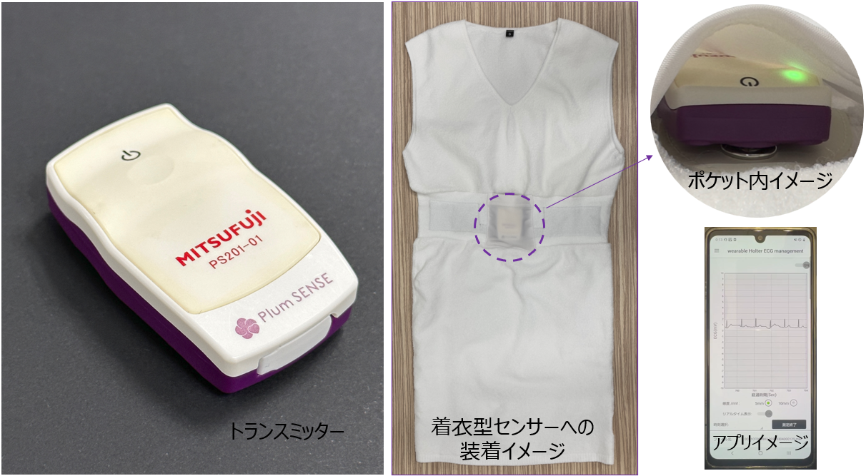 「着衣型携帯心電計PS201‐01」は、トランスミッター、着衣型センサー※1(スマートウェア)、スマートフォン、アプリ、AC充電器がセットとなっており、当社が独自に開発した銀めっき導電性繊維AGpossを電極として編み込んだ着衣型センサーの外ポケットにトランスミッターを装着し、下着のように着用いただき、データ保存・転送機であるスマートフォン※2を携行するだけで、いつでも、どこでも、誰でも簡単に、日常生活において心電図測定が可能※3です。2023年2月より販売を開始いたします。