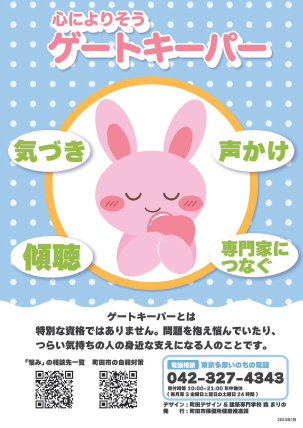 身近な人の悩みに気づき支える人である「ゲートキーパー」の役割について周知を図るため、ポスターとクリアファイルを作成し、町田市内の鉄道駅やバス車内、医療機関、薬局等で掲示・配布します。