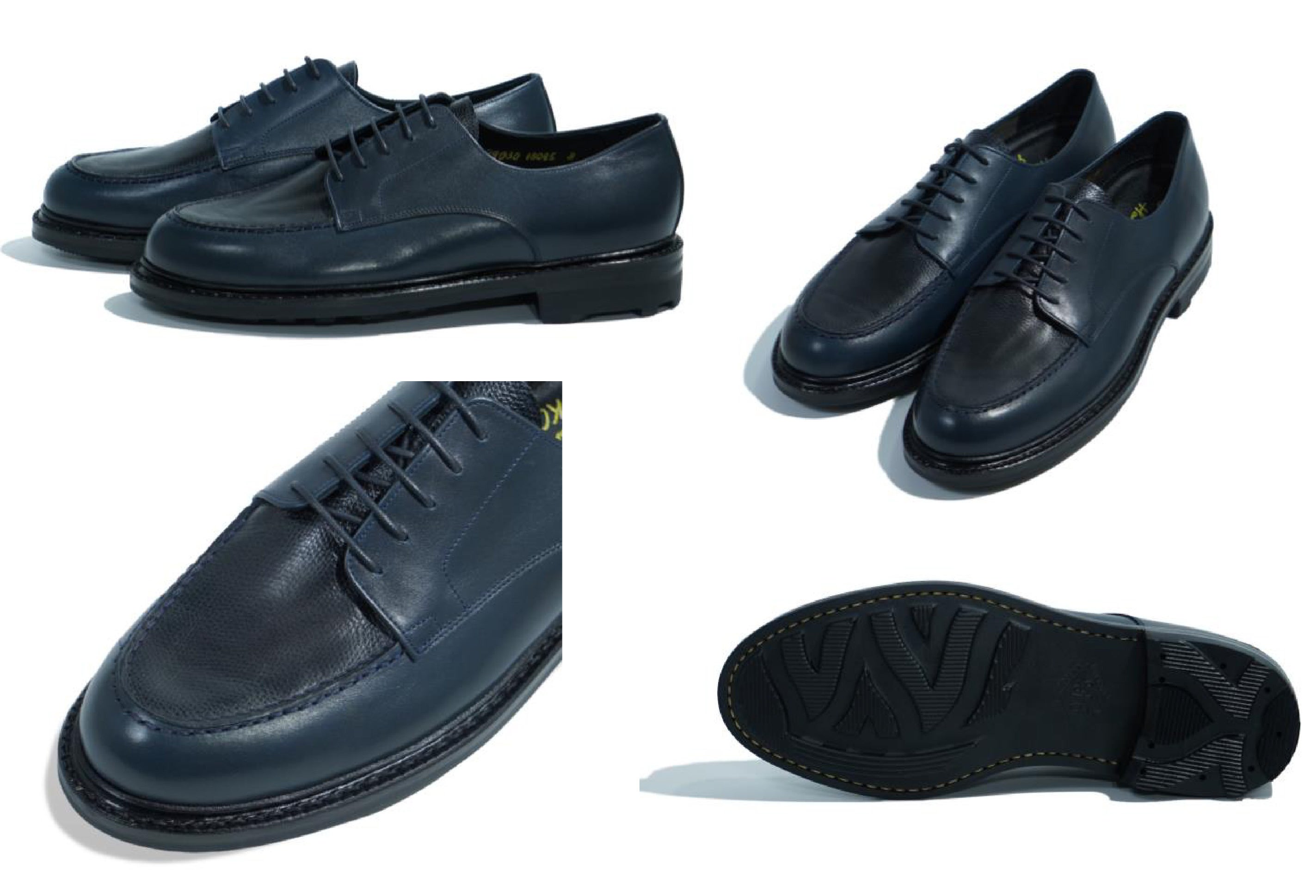 「港町横浜×Jalan Sriwijaya」をテーマに、それぞれのイメージカラーでもあるネイビーを配した特別モデル。ヴァンプに型押し加工を施したブラックグレインレザーを採用することで、上品さも兼ね備えた大人カジュアルな雰囲気を演出します。