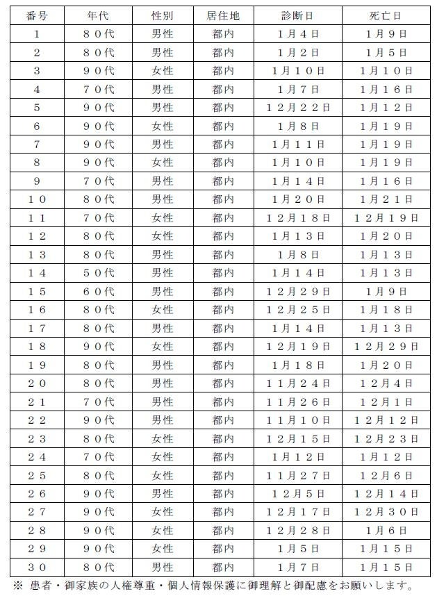 新型コロナウイルスに関連した患者の死亡について business Twitter Facebook はてブ Pocket LINE コピー 2023.01.23 この記事は約1分で読めます。 都内で新型コロナウイルスに感染した方が死亡されましたのでお知らせします。 お亡くなりになった方のご冥福をお祈り申し上げます。 1 新型コロナウイルスに関連した死亡者(本日公表分) 2 新型コロナウイルスに関連した死亡者の累計 7,462人