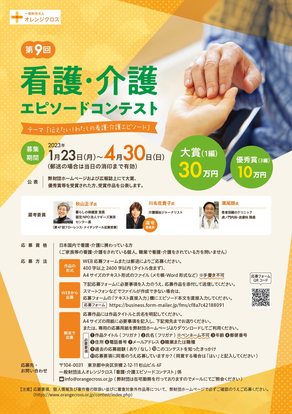一般財団法人オレンジクロスは第9回看護・介護エピソードコンテストの作品を2023年1月23日(月)~4月30日(日)で募集いたします。