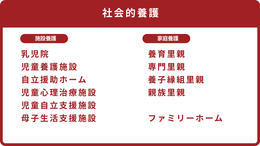 社会的養護とは、「保護者のない児童や、保護者に監護させることが適当でない児童を、公的責任で社会的に養育し、保護するとともに、養育に大きな困難を抱える家庭への支援を行うこと」(厚生労働省)