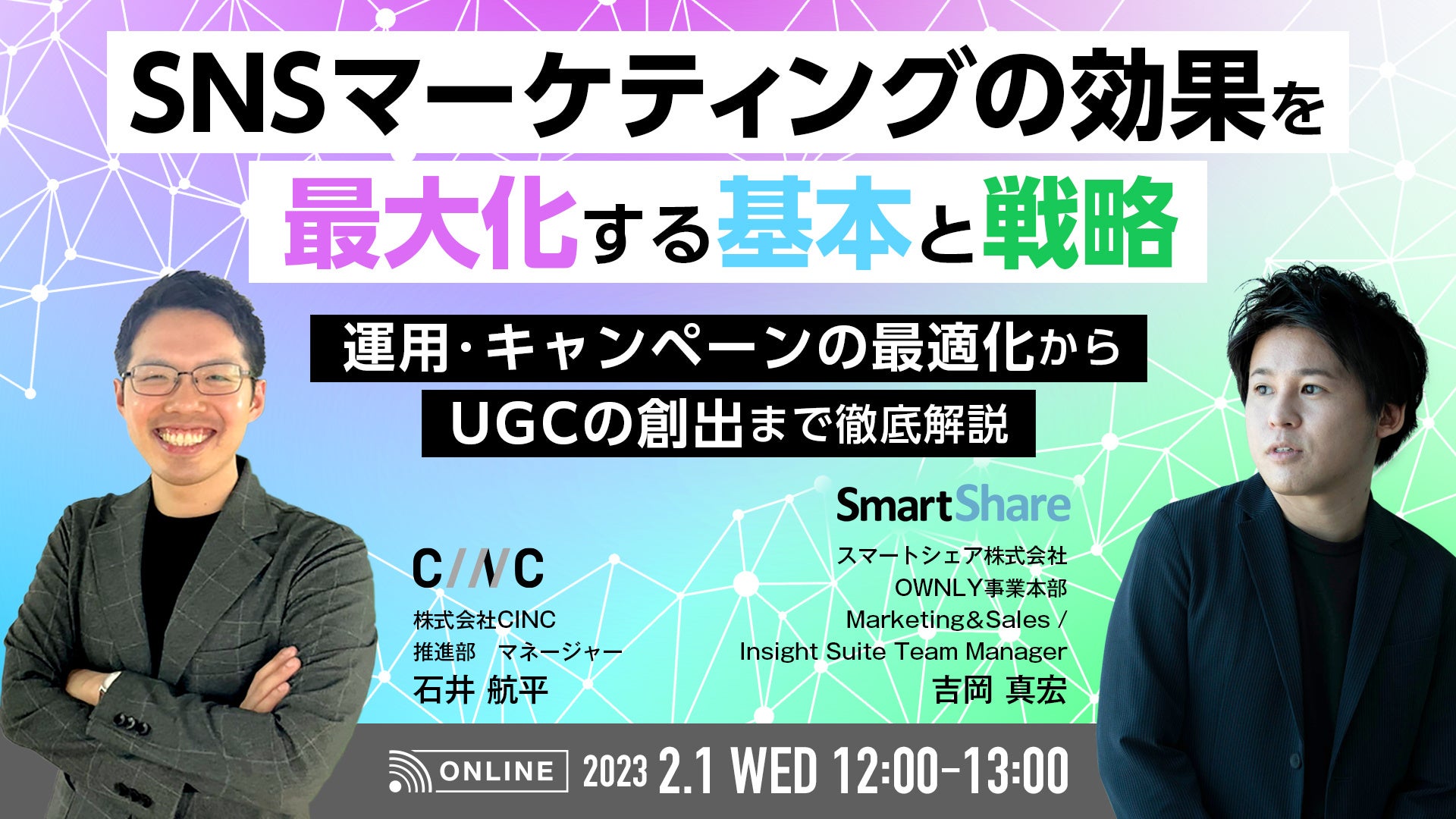 SNSマーケティングに強みをもつ、株式会社CINCとスマートシェア株式会社より、オーガニック運用・キャンペーンの最適化からUGCの創出に至るまで、SNSマーケティングの効果を最大化する基本と戦略を、実際の事例をもとに徹底解説いたします。