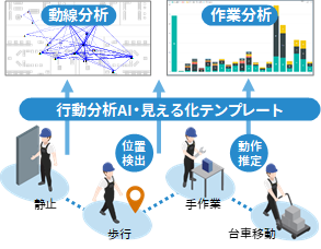 デバイスから複数作業員の位置・発話・動作のデータを同時収集し、AIにて自動分類(動作データに適用)して、時系列に統合管理。属人的な作業が多く、作業手順の作成・見直しが必要な現場に導入することで、非効率作業を削減。