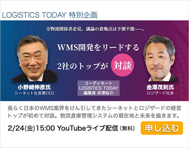 クラウド型在庫管理システムのリーディングカンパニーであるロジザード株式会社(東京都中央区、代表取締役社長:金澤 茂則、以下:ロジザード)は、国内最大の物流ニュースサイトを運営するLOGISTICS TODAY株式会社(東京都新宿区、代表取締役社長:赤澤 裕介)が企画した、『物流デジタル変革の行方 ~ WMS開発上位2社の経営トップが対談 ~』への登壇が決定しましたのでお知らせいたします。