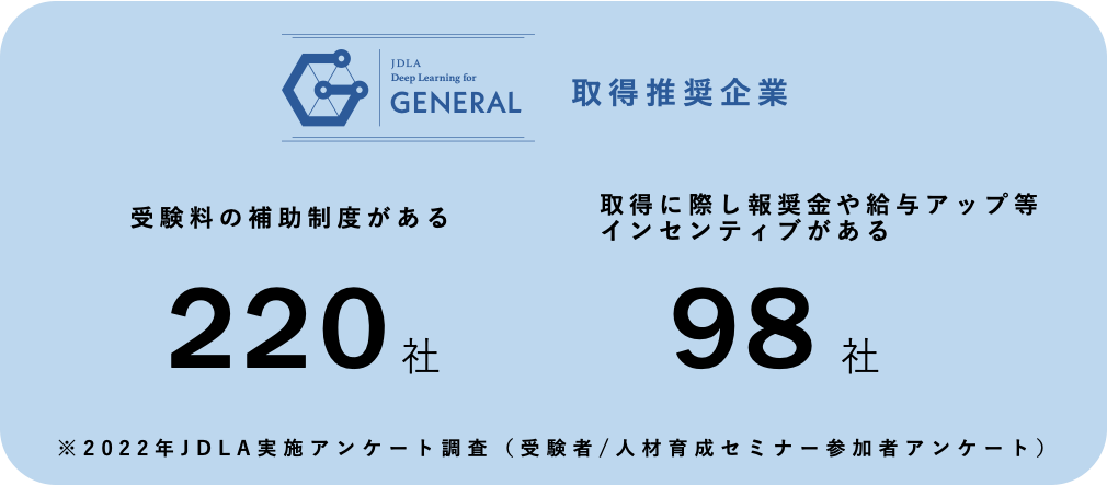 また、JDLAの2022年のアンケート調査では、G検定受験推奨企業は現在249社(受験料の一部、もしくは全額補助実施企業は220社、取得に際して報奨金や給与アップなどのインセンティブを支給している会社は98社)にのぼり、業種や職種を問わず、企業における導入は加速しています。