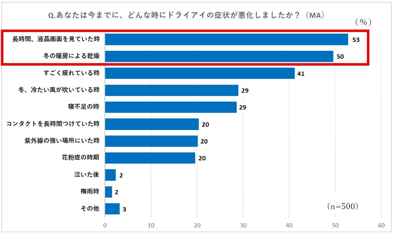ドライアイの症状が悪化するのは、患者さんの半数が「長時間、液晶画面を見ていた時」「冬の暖房による乾燥」と回答。