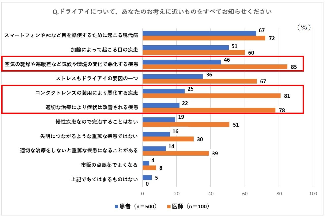 ドライアイは、「スマホやPCで目を酷使するためにおこる現代病」(患者さん67% 医師72% )また、「加齢による目の疾患」(患者さん51% 医師60%)という点では、医師と患者さんともに共通の認識であるものの、ドライアイは、「空気の乾燥や寒暖差など気候や環境の変化で悪化する」(患者さん46% 医師85%、)、あるいは、「コンタクトレンズの装用で悪化する」(患者さん25% 医師81%)、「ストレスもドライアイの要因の一つ」(患者さん36% 医師67% )など、疾患についての患者さんの認識の低さが浮き彫りになった。