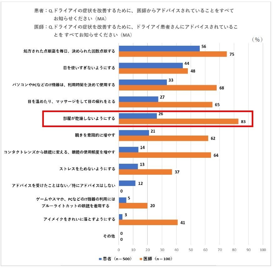 ドライアイの症状を改善するために83%の医師が「部屋が乾燥しないようにする」ことをアドバイスしているが、患者さんでは26%しか、同様のアドバイスを受けたという認識がない。