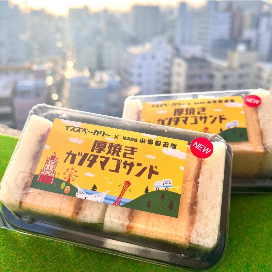 創業70年の山田製玉部 と 創業77年のイスズベーカリーがコラボ!山田製玉部の厚焼き玉子をパン粉に付けて揚げたカツタマゴと、イスズベーカリーの食パンに特製ソースをつけてサンドしたコラボ商品。カツタマゴと特製ソースのハーモニーをぜひお試しください。