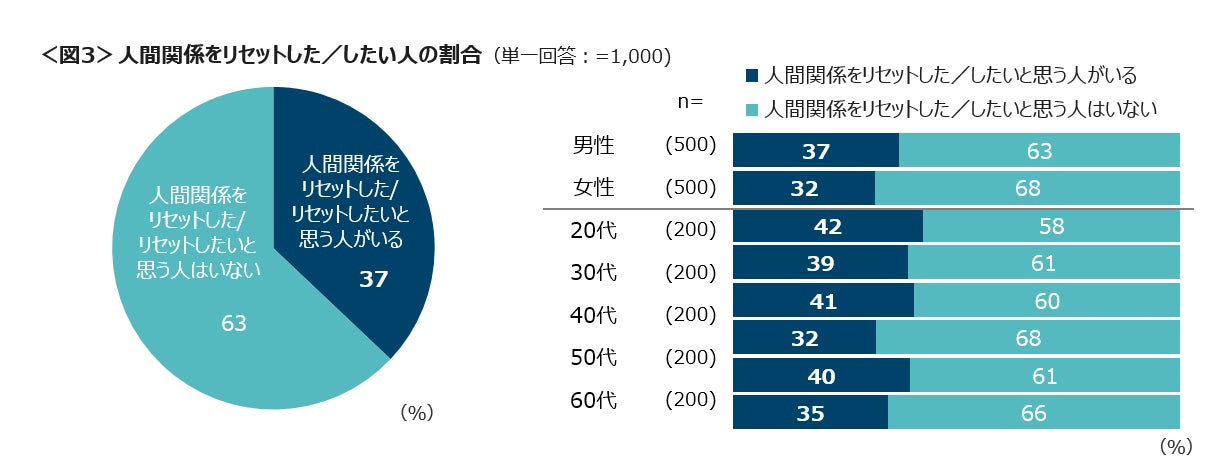 「人間関係をリセットした/したい人がいる」は37%、女性と30代、50代は4割を超える。<図3>
