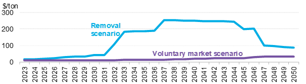 図1:ボランタリー市場および除去シナリオ下でのカーボンオフセット価格
