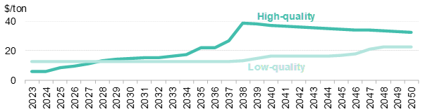 BNEFの三つ目のシナリオは分岐シナリオです。当議論は市場を二つに区分けすることを想定しています。一つの市場は、規模が小さく流動性の低い高品質オフセット市場となります。具体的には技術ベースでの炭素除去や、アフリカ、北米、オセアニアにおける自然ベースのソリューションを用いたオフセットを含みます。高品質なオフセットの需要は、2030年にはわずか4億3300万トン、50年には13億トンとなる見込みとなっているものの、買い手は同じそれぞれの年に14億トンおよび32億トンと、当レポートの他のシナリオよりも限られたオフセットの供給に直面することになります。価格は、2039年に1トン当たり38ドルでピークに達し、2050年には1トン当たり32ドルまで下落すると予想されます。