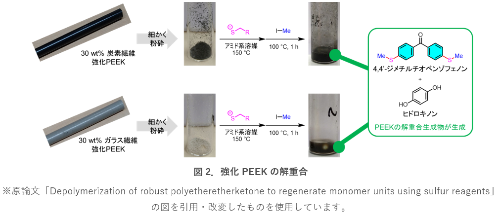 今回見つけた解重合法は、純粋なPEEK素材だけでなく、炭素繊維やガラス繊維で強化したPEEK材料にも利用できます。炭素繊維を30wt%含む強化PEEK素材を細かく粉砕し、適量の硫黄求核剤とアミド系溶媒を用いて解重合し、ヨウ化メチルで処理すると、PEEKのモノマー単位まで分解した4,4’-ジメチルチオベンゾフェノンとヒドロキノンを含む解重合混合物が得られます(図2)。ガラス繊維強化PEEKを用いて同じ解重合を適用しても、同様の生成物が得られます。また、純粋なPEEK素材の解重合にポリプロピレンやポリスチレン、ポリアミドを共存させても、PEEKの解重合が問題なく進行することも確認しました。本解重合法は、複合PEEK材料や他のポリマーの共存下でも適用できます。