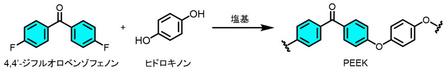 正式名称「Poly Ether Ether Ketone」である樹脂。高機能を発揮する熱可塑性樹脂であり、スーパーエンジニアリングプラスチックの代表格。一方で、高価な素材であることでも知られている。主に、4,4’-ジフルオロベンゾフェノンとヒドロキノンとの反応によって合成される。