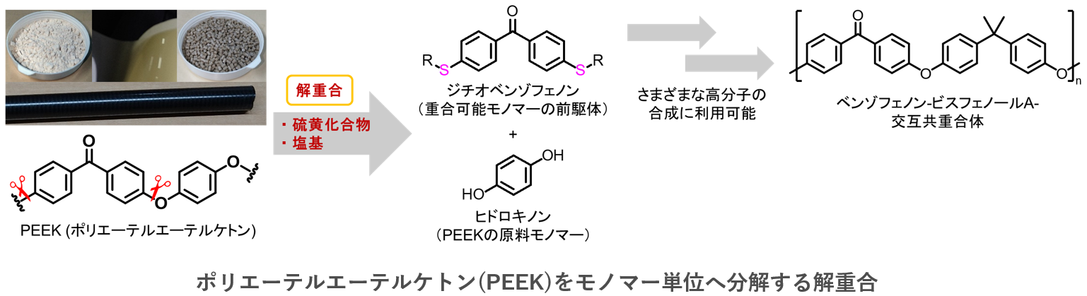 この技術は有機硫黄化合物のチオールと塩基を解重合剤に使用することによって、樹脂の一般的な熱分解温度の600~1500 ℃を大きく下回る150 ℃、19時間以内にPEEKをモノマー単位へと分解します。また、重合可能モノマーの前駆体(ジチオベンゾフェノン)とPEEKの原料モノマー(ヒドロキノン)をそれぞれ93%、95%という高収率で得ることができます。PEEKのモノマー単位への解重合は、世界で初めて成功しました。ポリプロピレンやポリアミドなどの樹脂を含む場合でも、また、炭素繊維強化PEEKなどの複合PEEK材料を用いる場合でも、PEEK成分の選択的な分解が可能です。得られたモノマーからベンゾフェノン-ビスフェノールA-交互共重合体などいろいろな高分子を合成できます。今回開発した技術はPEEKのケミカルリサイクルの道を切り開くとともに、PEEK以外のスーパーエンプラ解重合にも応用できると考えられ、安定樹脂材料のサーキュラーエコノミーに貢献します。