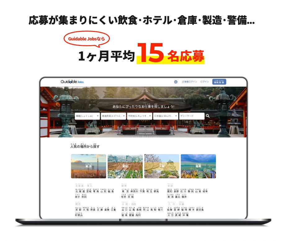 新型コロナウイルスの感染症法5類見直しが間近となり、「アフターコロナ」が迫っています。2022年12月の訪日外国人は2019年比で54%まで回復。完全復調とはいえないものの、観光地へ赴けば多国籍の言語で会話が入り乱れる光景が時たま見られるようになりました。飲食やホテル等の外国人対応が必要な職種はもちろんのこと、倉庫・製造・警備等の外国人採用ニーズが高い領域においても、Guidable Jobsは1ヶ月平均で15名の応募※が集まります。