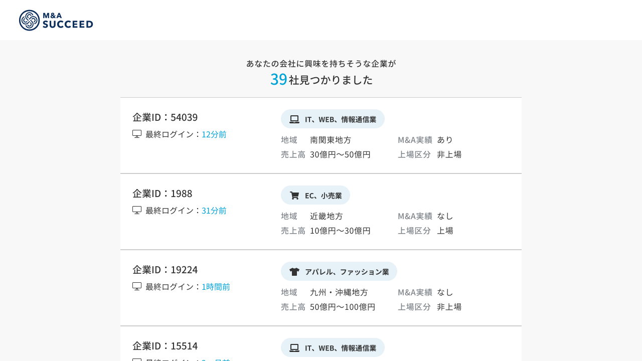 さらに簡単な情報を入力すると(所要時間約1分)、全ての候補企業(匿名)の会社概要(業種、過去売上高、所在地域、上場の有無、M&A経験の有無、最終ログイン日)が表示されます。