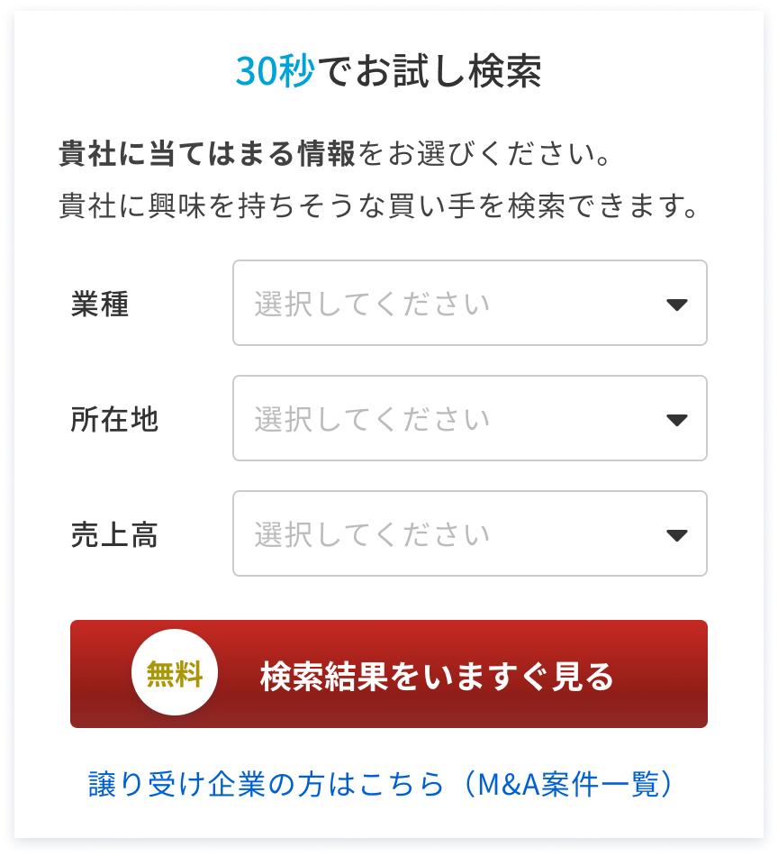 このたび、経営者様からの声に応え、早い段階からM&Aを経営の選択肢の一つとして考えていただけるよう、簡単に譲り受け候補企業のお試し検索ができる機能の提供を開始しました。この機能の検索結果では、譲り受け候補企業の情報は匿名の範囲内であるため、秘匿性を守りつつ、情報を提供できます。