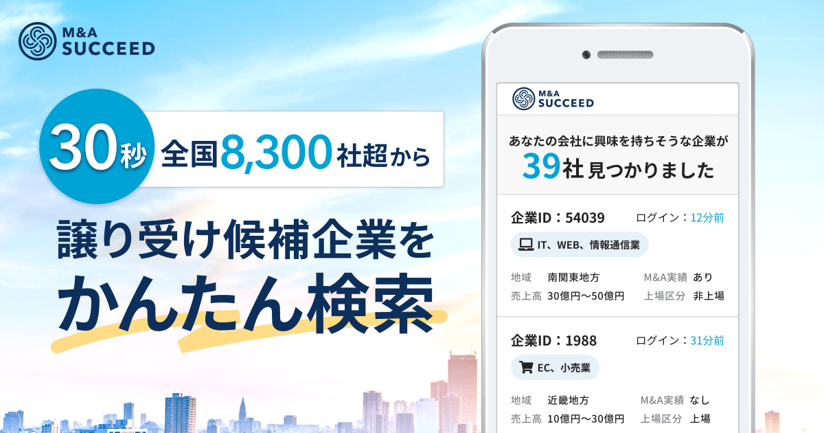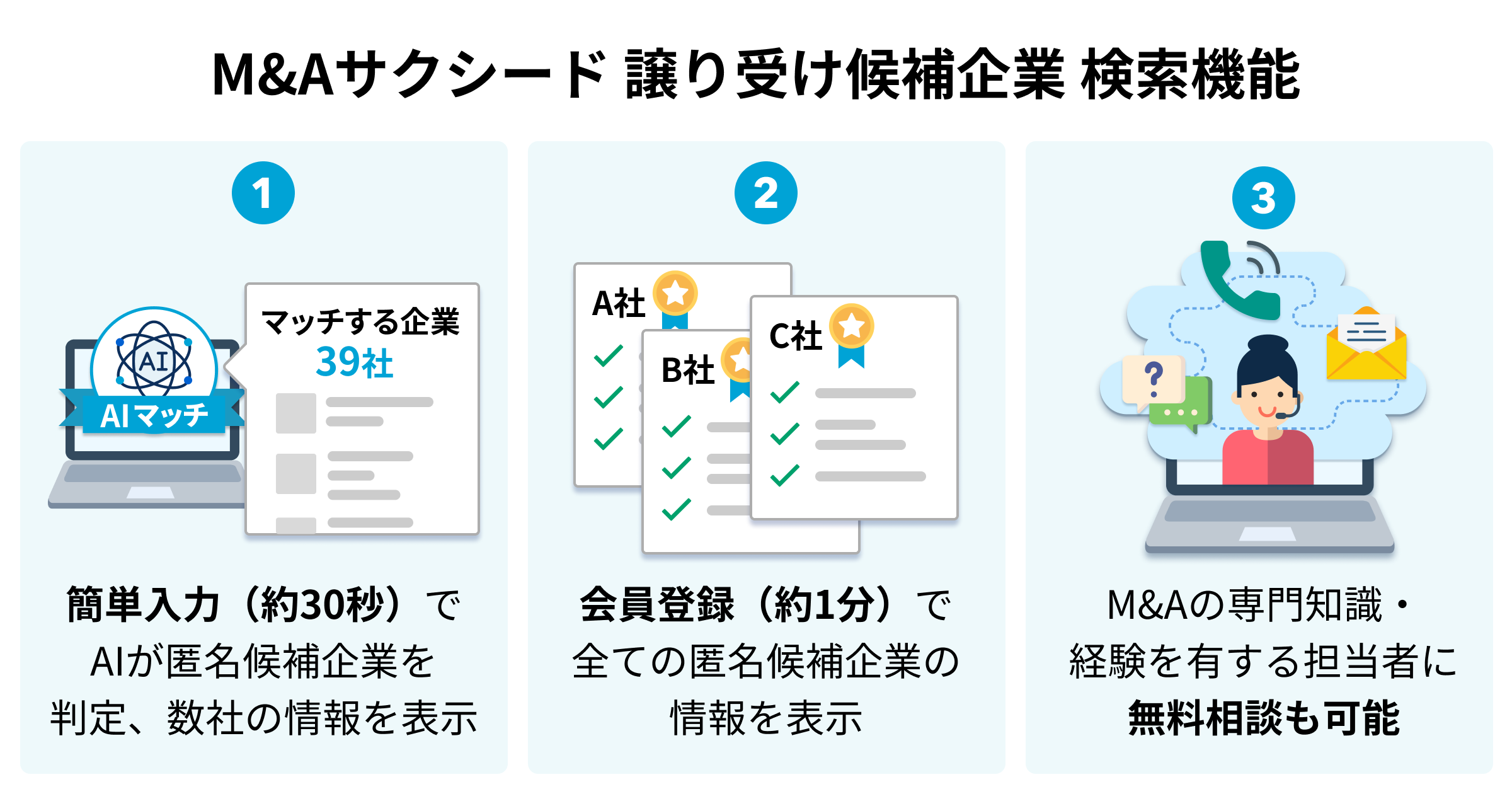 「M&Aサクシード」は、譲渡企業と譲り受け企業をオンライン上でつなぐ法人・審査制M&Aマッチングサイトです。譲渡企業は「M&Aサクシード」に会社や事業の概要を匿名で登録でき、譲り受け企業はその情報を検索して閲覧できます。譲り受け企業は興味を持った譲渡企業へ直接アプローチできるため、譲渡企業にとっては、潜在的な資本提携先の存在や、自社の市場価値を把握するきっかけになります。これにより、譲渡企業は経営の選択肢の一つとしてM&Aを早期から検討でき、経営者の選択肢が広がります。2017年11月にサービスを開始し、全国の譲渡案件が累計14,200件以上(掲載中3,900件以上)登録され、利用中の譲り受け企業は8,300社以上です(2022年12月時点)。URL:https://ma-succeed.jp/
