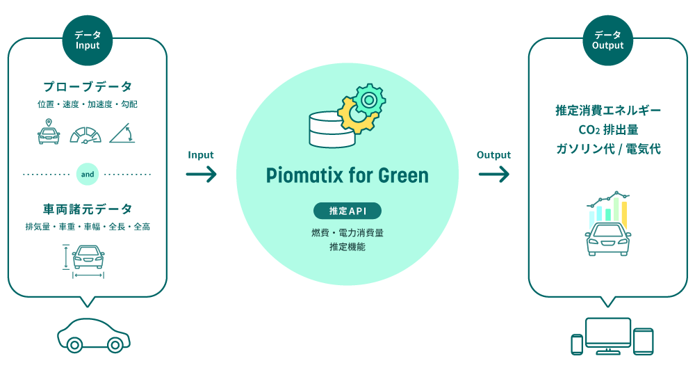 ガソリン車の燃費、EVの電力消費率を推定する特許技術とルート探索技術、独自のモビリティAIプラットフォーム「Piomatix(パイオマティクス)」を組み合わせ、車の移動に伴うCO2排出の削減をサポートするパイオニア独自のプラットフォーム“Piomatix for Green”。当社は、“Piomatix for Green”を活用し、さまざまなニーズや用途に合わせて、環境課題解決につながるソリューションを提供しています。