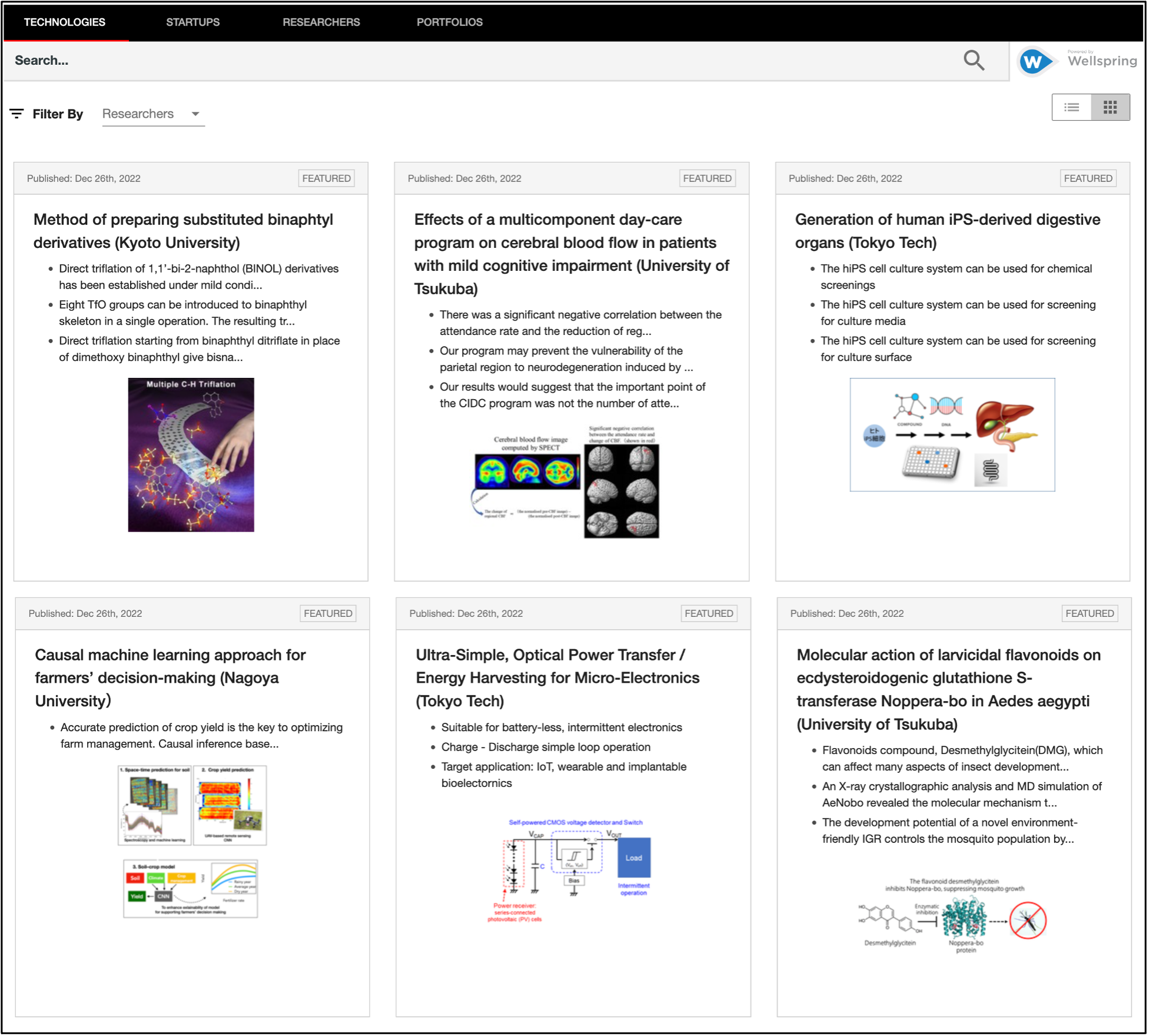 ウェルスプリングでは、世界最大規模のイノベーションマーケットプレイス「フリントボックス」を長年に渡り提供しています。マーケットプレイスには約45,000件に及ぶイノベーションシーズが常時掲載され、共同研究相手や共創相手の募集、知財をはじめとする技術シーズの露出からライセンシングまで、全てオンライン上で完結できる仕組化がされています。カーネギーメロン大学やハーバード大学など、国内外の著名な学術機関や研究組織にご愛顧いただいており、そうした組織様の更なる活躍や成功に貢献をしています。