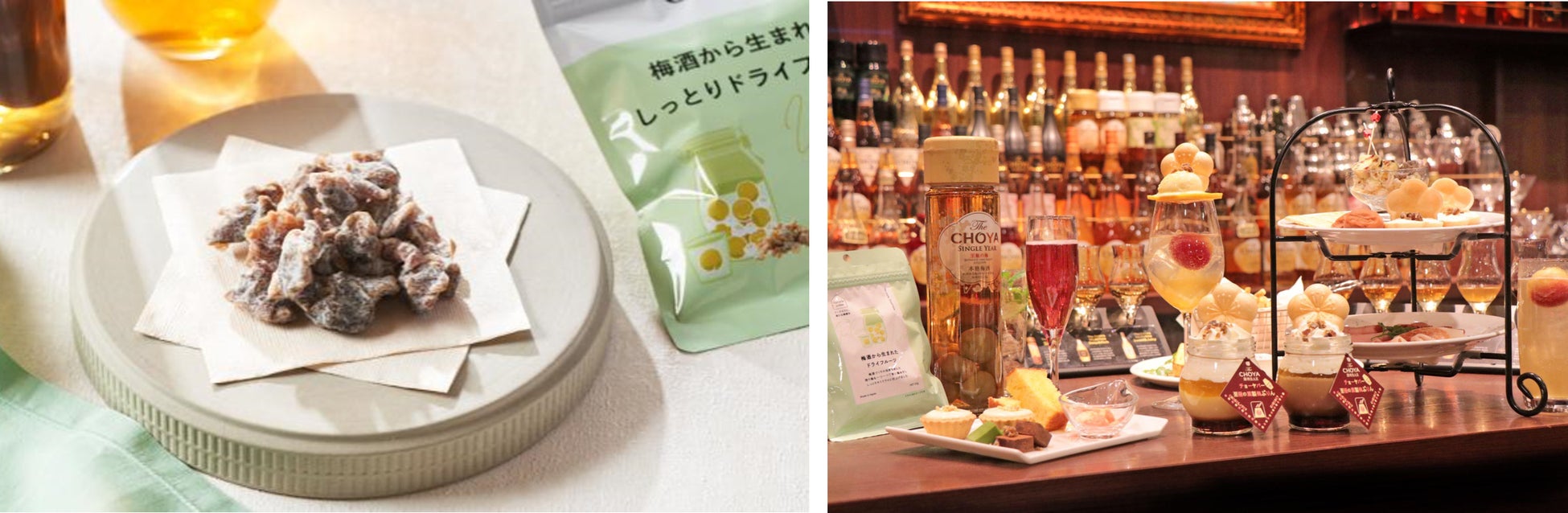 今回の新商品発売を記念し、チョーヤ梅酒が運営する「The CHOYA 銀座BAR」では、梅づくしアフタヌーンティーのコースを期間限定で展開します。ドライフルーツをコース内の5つのメニュー★に提案、試作を重ねて両社の思いをお伝えできるコースになっています。また期間中は店内で「梅酒から生まれた しっとりドライフルーツ」の販売も行います。