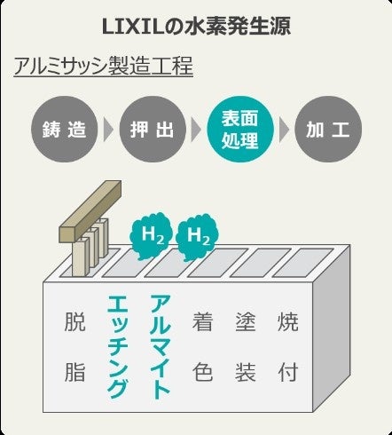 東京ガスとLIXILは、製造工程から発生する副生水素の回収・利用についても検証を進めています。アルミ形材を製造するLIXILの国内工場のアルマイト処理(*4)工程で、2022年8月にLIXILと共同で実施した検証試験では、発生する水素を90%以上の効率で回収することに成功しました。