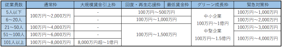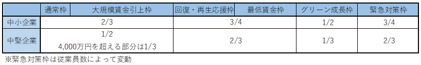 補助枠・補助率は企業規模や従業員数で異なりますが、補助額は最大1.5億円、補助率は最大3/4です。