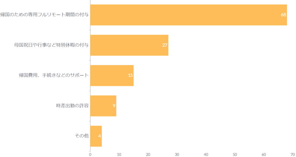 帰国事情に関しては、3/4以上の回答者は年間2週間以上の帰国を、そのうちの1/3以上は1ヶ月以上の帰国を希望しています。そして、導入してほしい体制として、帰国専用のフルリモート期間の付与が半数以上ありました。