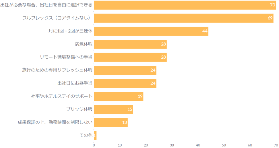 半数以上の回答者は、出社日の自由選択制度とフレックスタイム制度を希望しています。