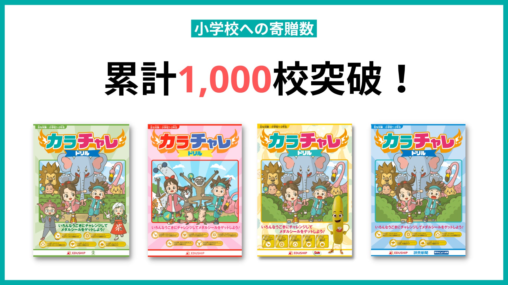 ​学校教材サービスカンパニーであるエデュシップ株式会社(所在地:埼玉県さいたま市、代表取締役:佐藤壮二郎)は、2021年秋よりスタートした新たな体育支援サービス「カラチャレ」の累計寄贈数が1,000校(寄贈部数約16万部以上)を突破したことをお知らせいたします。