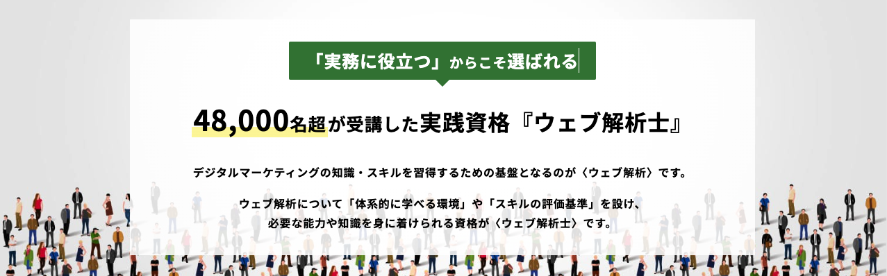 「アクセス解析を軸としたウェブ解析スキルを身につけ、データを読み取り、正しい判断ができるスキル」の会得を目標とした資格です。