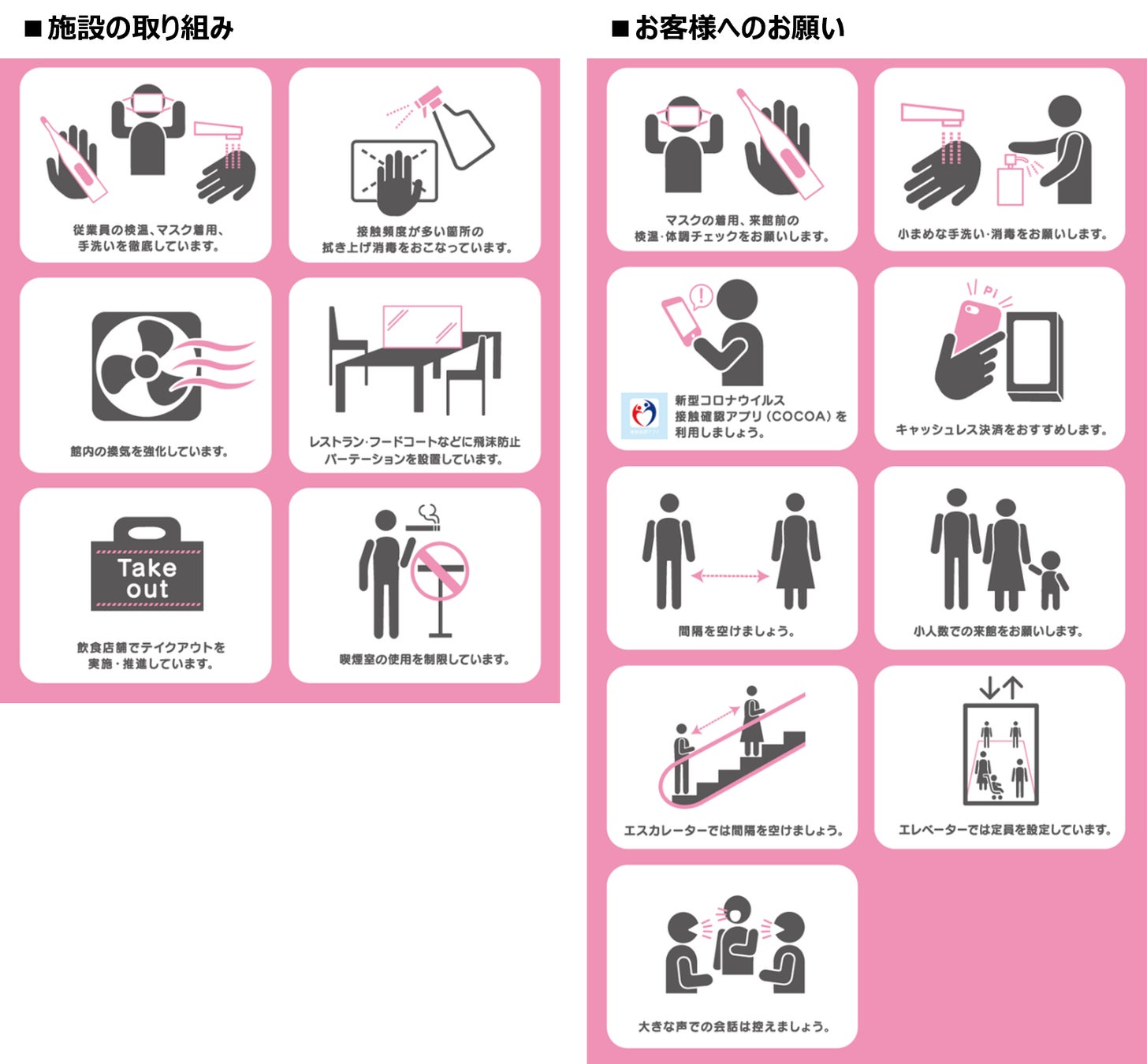 三井不動産グループが運営する商業施設では、新型コロナウイルス感染拡大防止のため、下記をはじめとした様々な取り組みを実施しております。