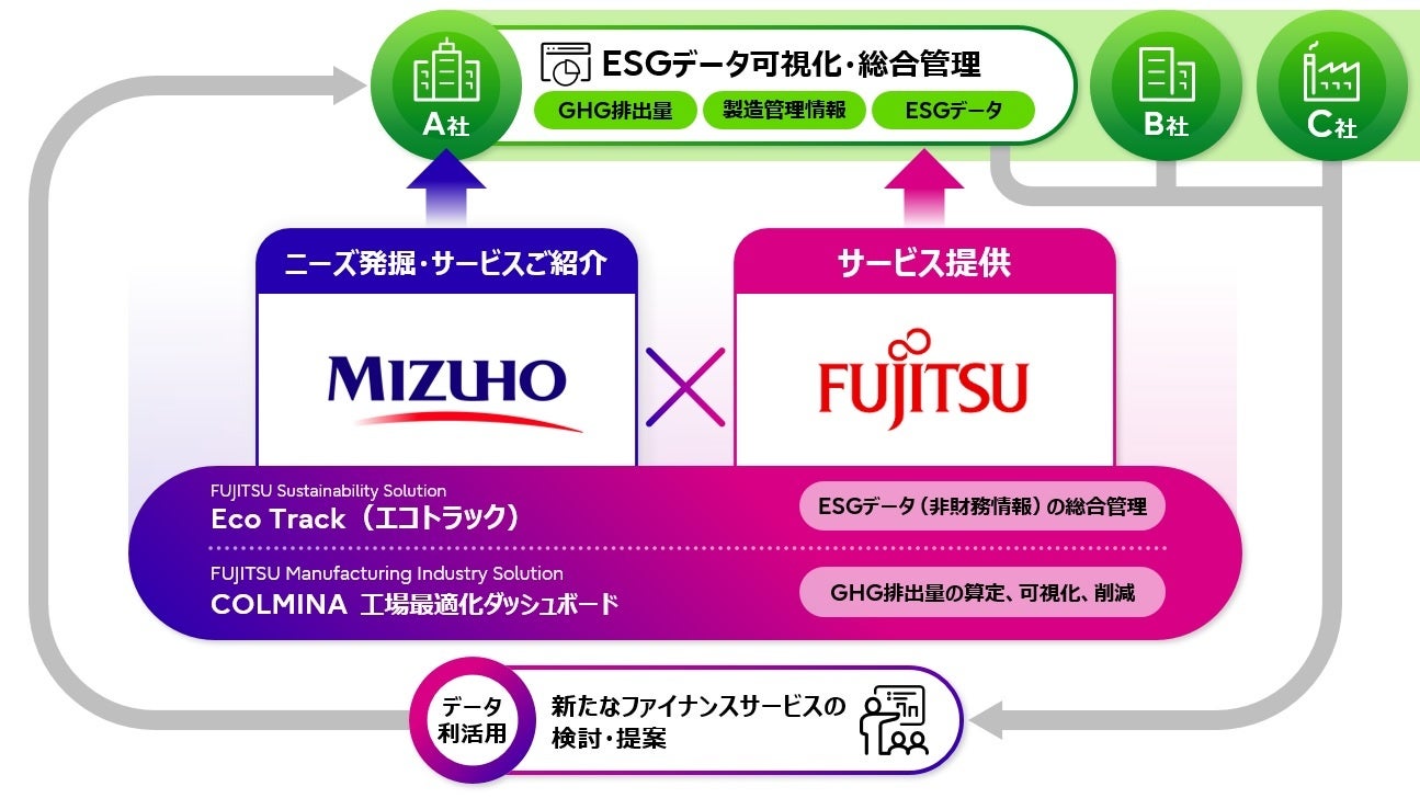 みずほ銀行のネットワークや知見を活用して、お客さまの環境経営に関する課題やニーズを伺い、富士通は、富士通Japan株式会社(代表取締役社長:砂田 敬之)のSaaS型サステナビリティ経営情報サービス「FUJITSU Sustainability Solution Eco Track」、および富士通の「FUJITSU Manufacturing Industry Solution COLMINA 工場最適化ダッシュボード」などをお客さまへ提供します。これにより、お客さまのGHG排出量が算定・可視化され、削減に向けた正確・効率的な分析が可能になります。また、本サービスを活用し、GHG排出量以外にも廃棄物、労働安全、社会貢献活動など多様なESGデータ(非財務情報)を総合管理することで、国内の省エネ法対応に加え、企業評価を高めESG投資を呼び込むためのCDP(注1)、TCFD(注2)、SBT(注3)、RE100(注4)などの国際イニシアチブに基づくスピーディかつ正確な情報開示が可能となります。