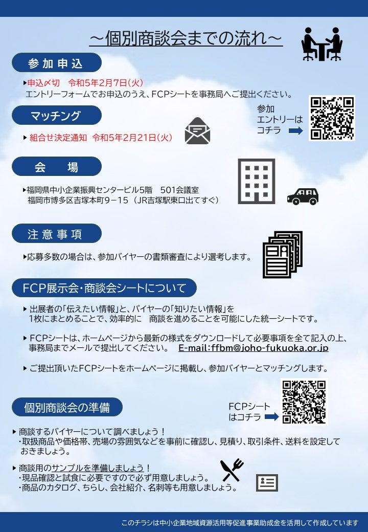 登録後、FCP展示会・商談会シート(以下、FCPシートという。)を提出して下さい。「FCPシート」とは、農林水産省が制作した出展者の「伝えたい情報」と、バイヤーの「知りたい情報」を1枚にまとめることで、効率的に商談を進めることを可能にした統一シートです。