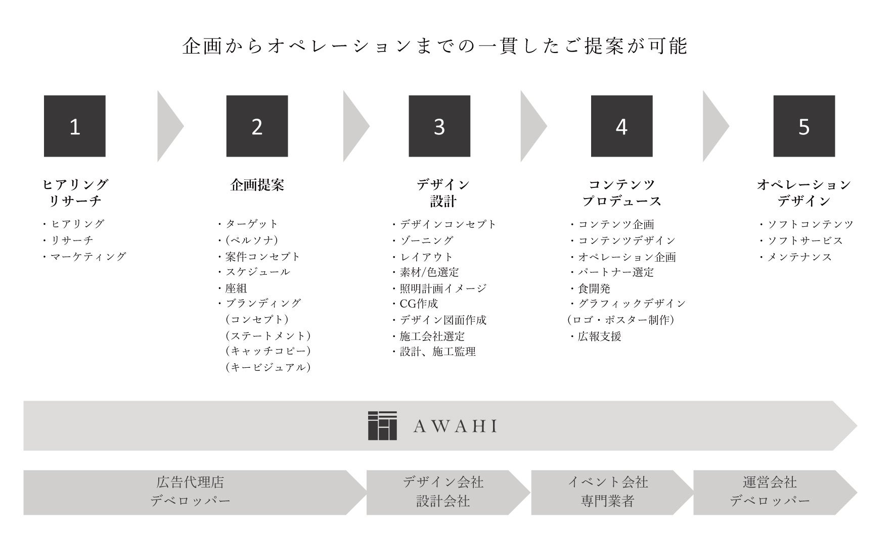 「AWAHI」では、日本の美意識で考える”空間づくり”と、習慣・伝統・文化に生きる”日本らしさ”をリデザインしたサービスで作り出す、新たな循環型社会モデルを提案・実現いたします。