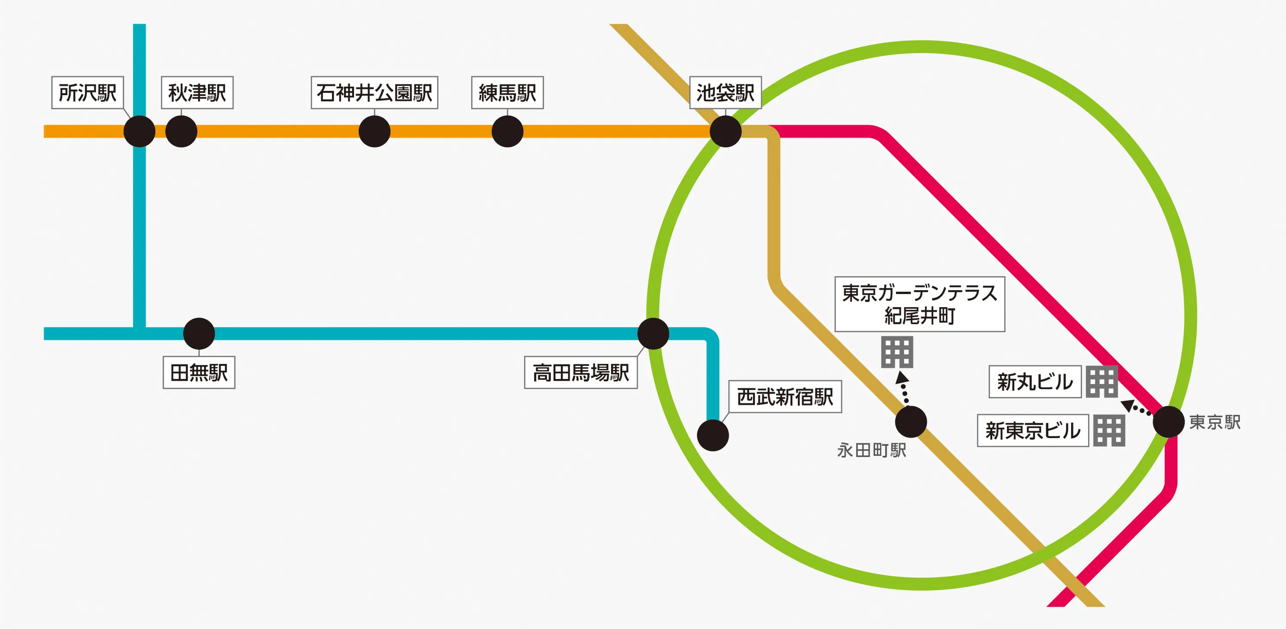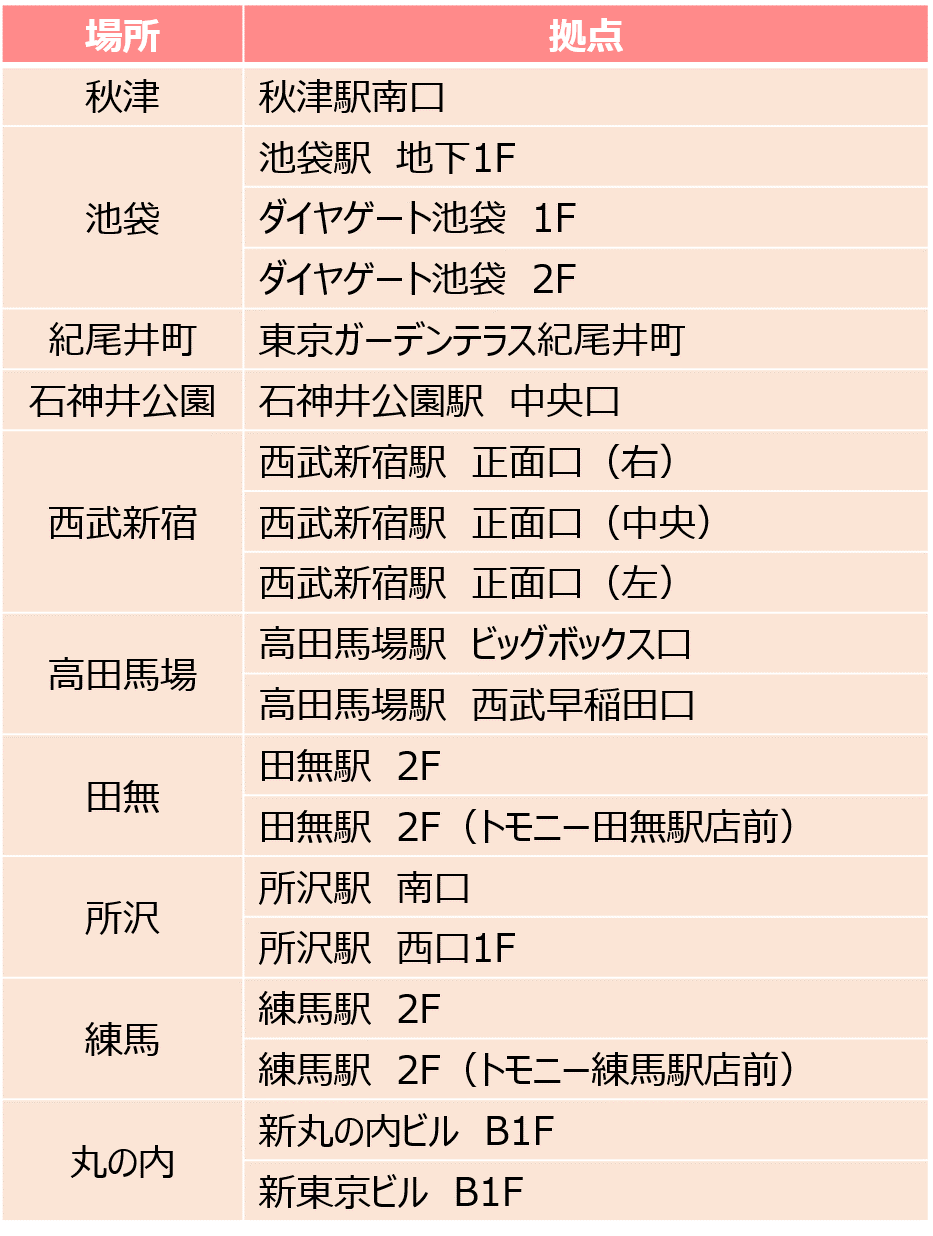 池袋、西武新宿、所沢、丸の内、紀尾井町など10カ所19拠点にて商品をお受け取りいただけます。