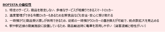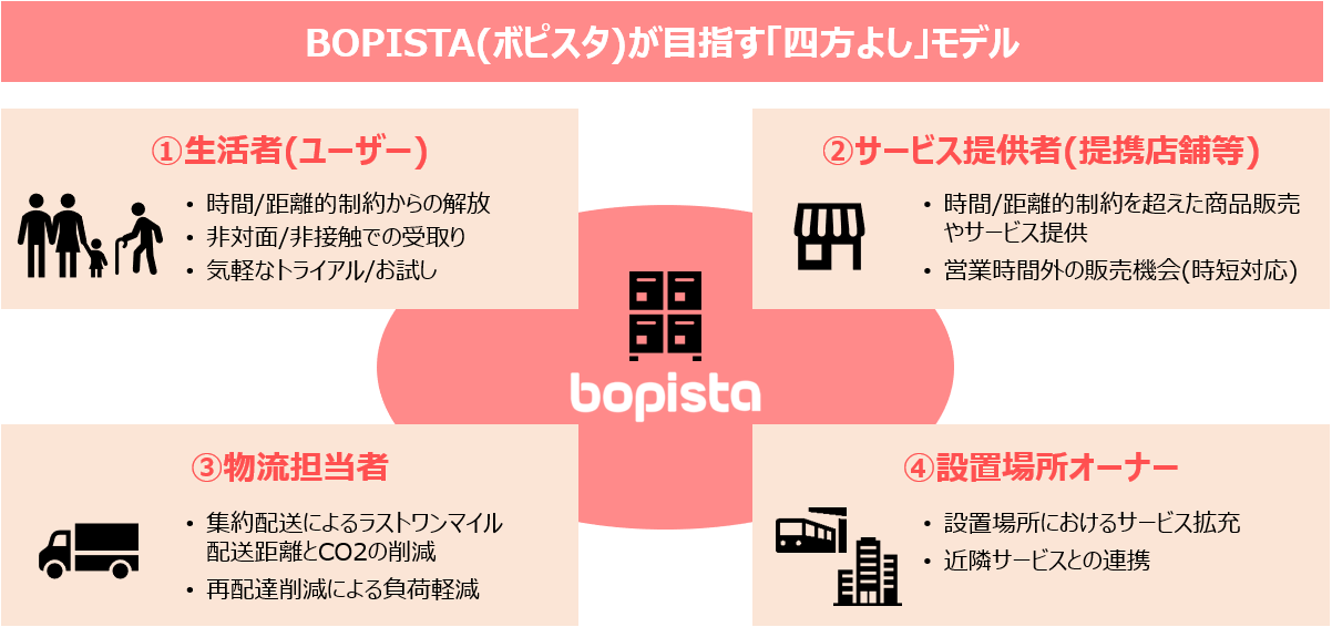 BOPISTAはもともと新型コロナウイルス感染症拡⼤の影響で人々の通勤・通学や⽣活スタイルが大きな変化を余儀なくされたなかで企画されました。駅や商業施設のロッカーを社会のインフラと捉えて、⽣活者・サービス提供者・物流担当者・設置場所オーナーの4者の観点からが各々の課題の解決とニーズの充⾜を満たす「四⽅よしモデル」を⽬指します。